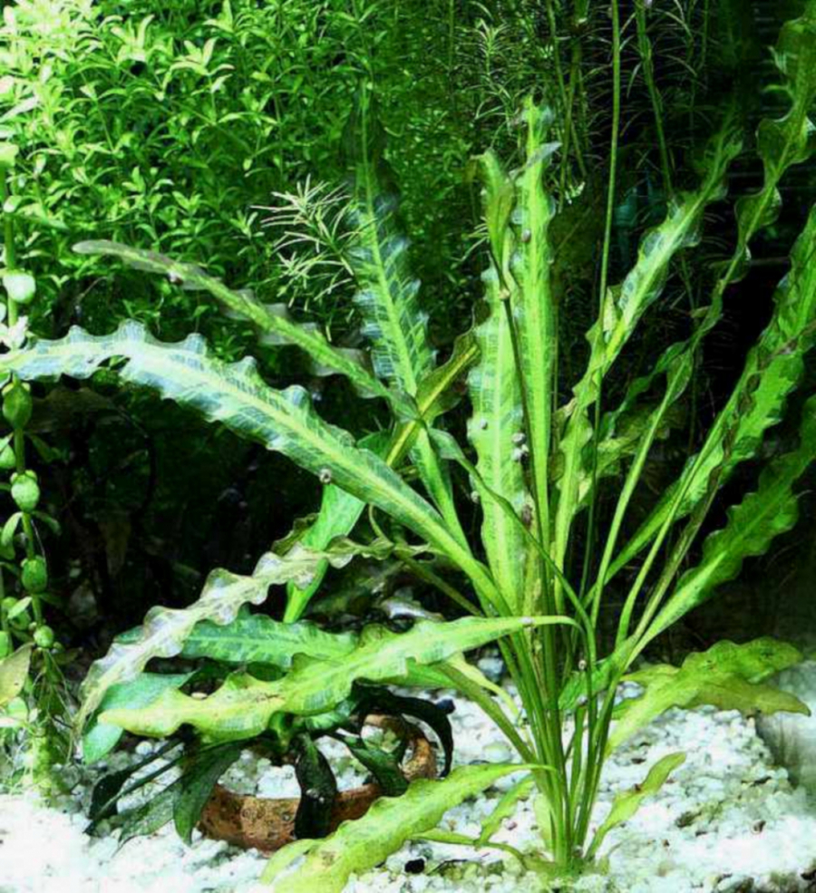 Размещать надо неплотными группами на заднем плане по периметру аквариума. Сажают группой через 5 см. Несколько экземпляров, высаженных раздельно, но близко друг от друга, создают оптимально благоприятный визуальный эффект. При пересадке может сбрасывать листья. В хороших условиях достаточно быстро образует густые заросли, которые периодически следует прореживать. Следует оберегать от обрастания водорослями. Его листья ланцетной формы и расположены на длинных черешках. Конец листа более или менее закруглен, края сильно волнистые, по сторонам центральной жилки по две продольных. Апоногетон волнистый принадлежит к тому виду растений, которые нетребовательны к условиям содержания, поэтому его можно рекомендовать начинающим аквариумистам. Необходимо под клубни положить кусочки глины и торфа, а также периодически производить подкормку CO2.